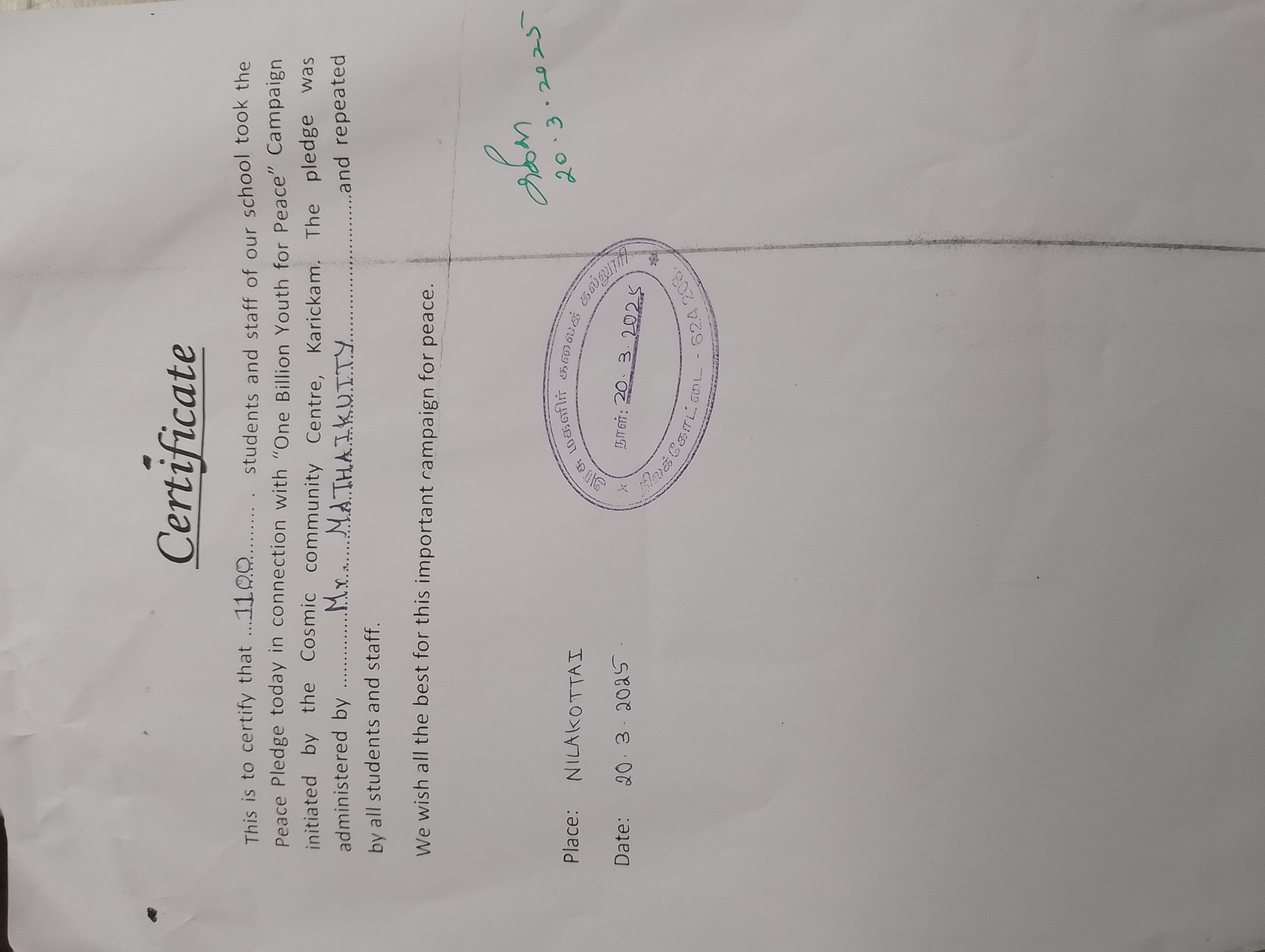Peace Pledge of "One Billion Youth for Peace" at Govt.Arts and Science College for Women, Nilaikotai, Tamilnadu on 20/03/2025. 1100 students and staff took the pledge.
